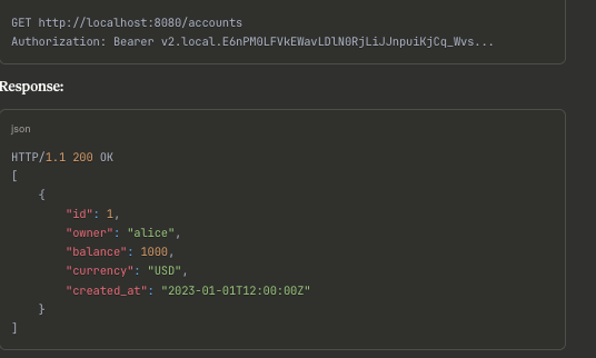 Authorizationheader. - Authorization: Once authenticated, we’ll enforce rules. For example, a user can only list their own accounts and can only transfer money from an account they own.