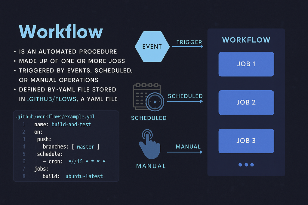 GitHub Actions automates workflows using YAML configuration files. Key components: