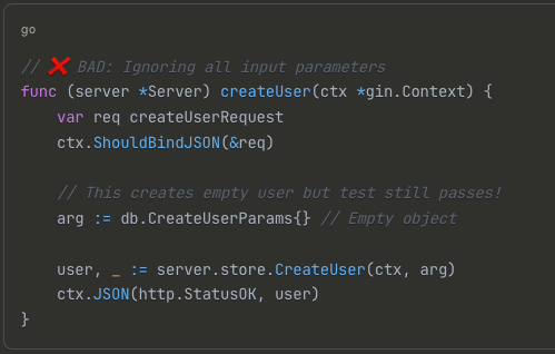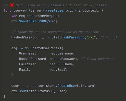 CreateUserParamsobject to the store, the test will still pass! - Incorrect password hashing: If the handler hashes a static string instead of the user’s actual password, the test will also pass!